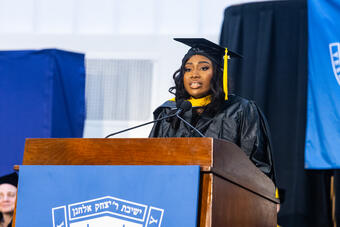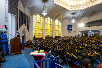 President Ari Berman addresses Katz School graduates in Lamport Auditorium at Zysman Hall.